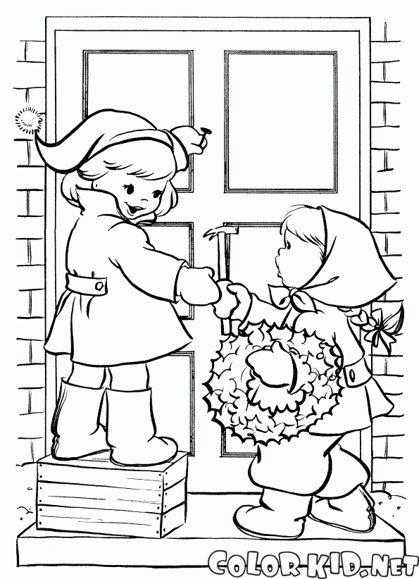 Desenho para colorir - Crianças pendurar uma coroa de flores