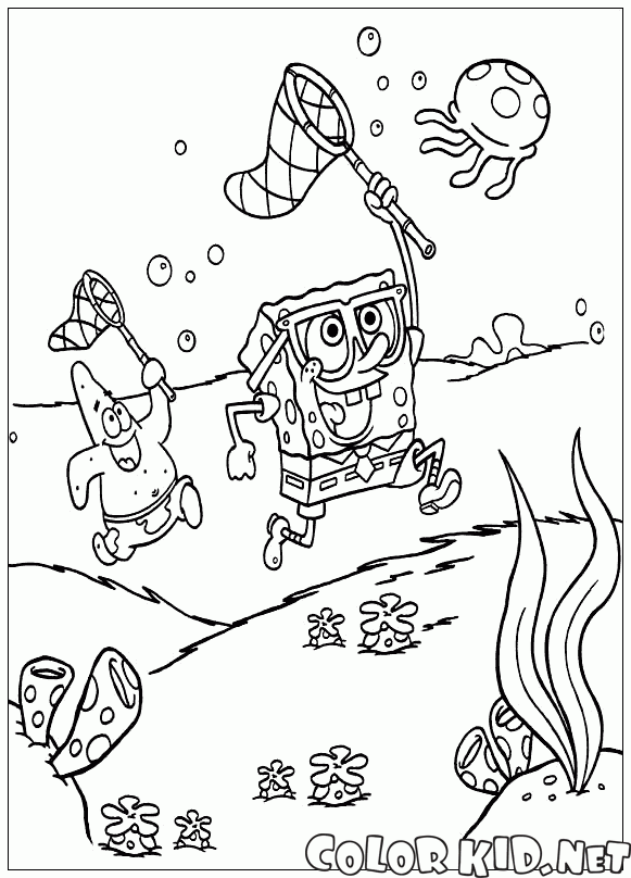 Desenho para colorir - Amigos pegar água-viva